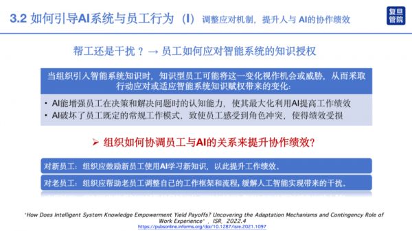 因此,论文建议企业在引入这样的AI系统之后,应该着力鼓励新员工更多地采用效益最大化的机制来应对AI系统。换言之,鼓励他们利用AI学习新知识,以提高工作绩效。对于那些已经熟悉了原有工作流程的老员工,组织应该帮助他们通过AI来调整自己的工作框架和流程,从而降低角色冲突,缓解AI所带来的干扰。