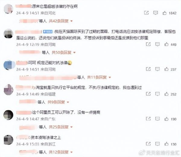 对于阿里巴巴客服不执行法律,有网友评论称“原来它是超越法律的存在啊”“规定还能对抗法律”“资本凌驾法律之上”……