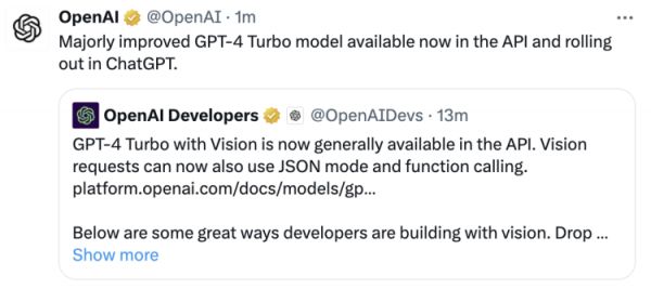在Google 用Gemini 1.5 Pro的升级和放量针对OpenAI的同时,OpenAI也有应对之策,宣布GPT-4 Turbo不再只是以预览版提供给开发者,而是发布了正式版。它自带读图能力不再需要调用GPT-4V接口,训练数据更新到了2023年底。与GPT-4普通版支持8K上下文相比,它能支持128k上下文。