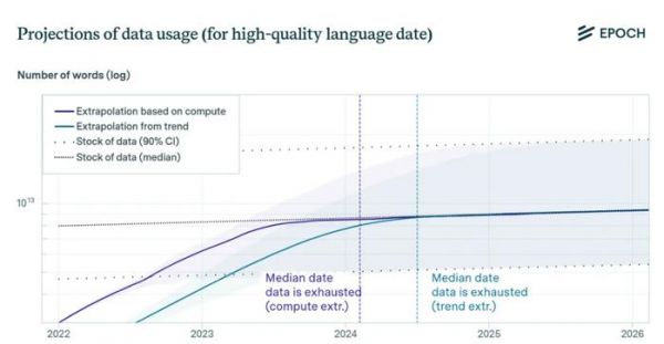 研究机构Epoch直白地表示,现在科技公司使用数据的速度已经超过数据生产的速度,这些公司最快会在2026年就耗尽互联网上的高质量数据。