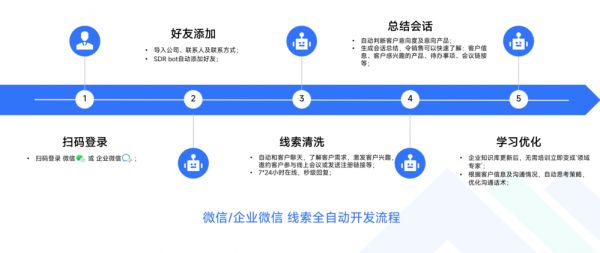 3.在销售线索激活的场景中,应用AIGC技术打造的SDR机器人重塑了自动化销售流程,人工扫码登录微信或企业微信,导入联系人后,就可以自动加好友、自动聊天、记录重要的聊天内容。此外,这可以做到7*24小时在线服务,可以秒级回复客户消息。更重要的是,通过总结规划、学习优化等过程,SDR机器人能够实时学习和进化,快速成为专家,为企业提供更好的服务。