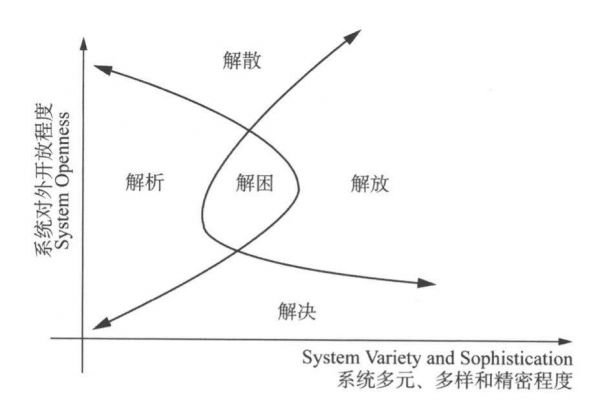 这个提法最早由鲍勇剑教授在《危机协同论》中提出,他使用系统的开放/多元程度坐标,厘定了危机的五种终局:解困、解决、解析、解散、解放。如下图所示:
