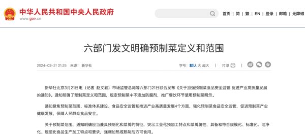 上文的通知,明确了预制菜定义和范围,规定预制菜中不添加防腐剂,推广餐饮环节使用预制菜明示。