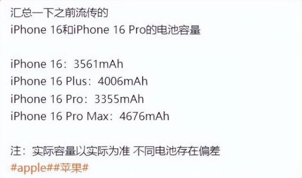 据爆料,iPhone 16可能会搭载3561mAh的电池,而Plus版则可能配备更大的4006mAh电池。Pro和Pro Max版本的电池容量预计分别为3355mAh和4676mAh。