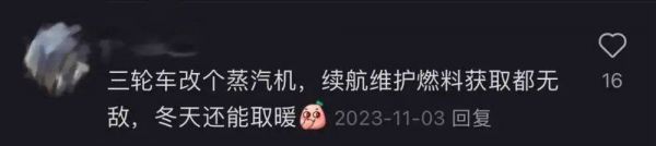“不好评价这到底是人开车,还是三蹦子折腾人。但无论如何,看到有人愿意费劲心机、不计成本为自己制造快乐时,你会觉得无论买三蹦子值不值,人一辈子能这么幸福地浪一回,起码是值了。”