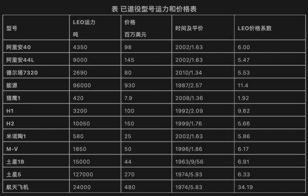 也就是这个标准具有较好的规律性和解释性,那么它适用于土星V、航天飞机等老型号吗?统计已退役型号运力和价格表如下,由于老型号定价时间不同,这里用历年CPI数据,换算到2022年的购买力平价做了一个小修正。