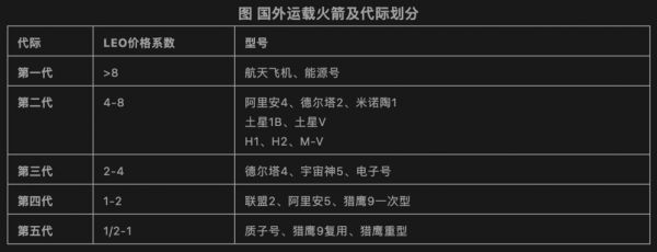 对全文总结如下,定义火箭价格系数指标,为火箭价格/运力(2/3),其中价格单位为千万美元,运力单位为吨。将LEO价格指数作为火箭划代唯一指标,进行火箭代际划分如下: