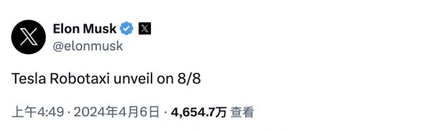 马斯克在 X 上官宣 Robotaxi 曝光日期|图片来源:X