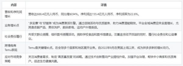拼多多第三季度的营收为688.4亿元人民币,同比增长94%,这一增长率远超市场预期。净利润达到155.4亿元人民币,净利润率为22.6%。