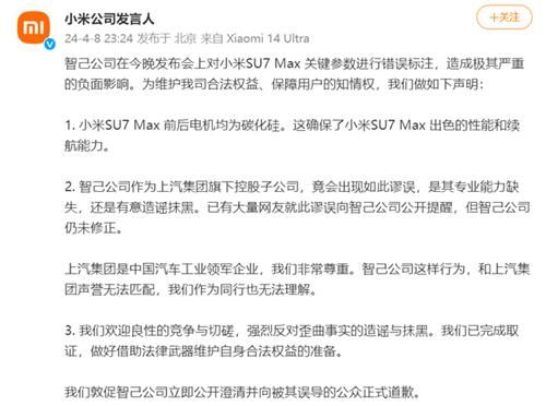 这不,在昨晚智己L6发布会上,智己全程对标小米SU7 Max,但把后者电机关键参数标错了。这下“好了”,此举不仅遭致网友反感,也迎来小米官方的严正声讨,连发三条微博谴责智己,要求其公开道歉。