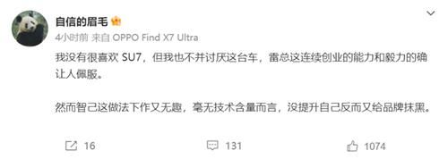 俗话说得好,出来混迟早要还的,智己做错事,就要立正挨打,这点不容狡辩。对此,OPPO前副总裁沈义人表示,“我没有很喜欢 SU7,但我也不并讨厌这台车,雷总(雷军)这连续创业的能力和毅力的确让人佩服。然而智己这做法下作又无趣,毫无技术含量而言,没提升自己反而又给品牌抹黑。”
