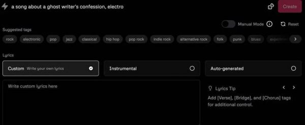 Udio 还有一个手动模式(manual mode),一般来说,Udio 会改写我们的提示词,提高生成的质量。