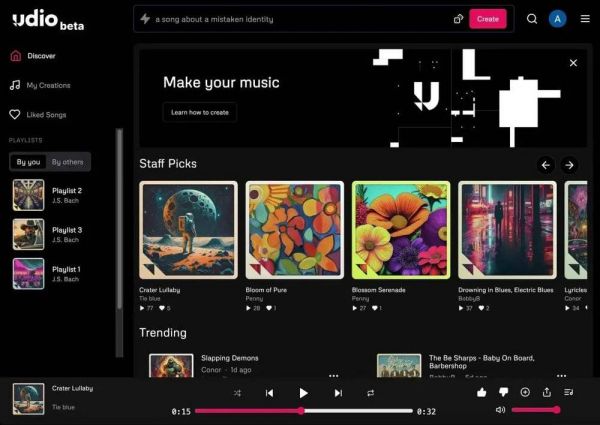 先看看 Udio 官方精挑细选的作品,直观感受好不好听。