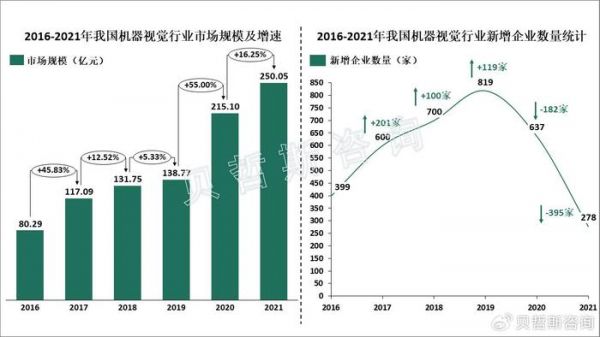 目前,我国机器视觉行业处于快速发展阶段。数据显示,自2016年以来,我国机器视觉行业市场规模逐年上升。2026年为80.29亿元,到2020年已达215.10亿元,同比增长高达55%;2021年,器市场规模继续增至250.25亿元,同比增长16.25%。相较于人工视觉,机器视觉拥有精度高、速度快、适应性强、可靠性高、效率高等优势,极大提升了生产智能化程度。在我国人工成本增加、数字化转型、制造业效率和质量要求提高的大背景下,机器视觉正在逐步替代人工,“机器换人”大势所趋。因此,未来我国机器视觉行业将继续向好发展,预计到2025年,市场规模有望达到469亿元。