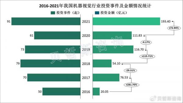 从行业投融资情况来看,我国机器视觉行业投资事件数量和金额总体呈上升趋势。数据显示,2021年我国机器视觉行业投资事件91起,较2020年增加30起;投资金额193.4亿元,较2020年增长72.94%。