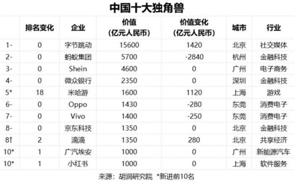 排名有所下滑的独角兽有四家。总部杭州的蚂蚁集团下降一位至第四,价值下降2800多亿至5700亿元;创立于广州的跨境电商Shein下跌一位至第五,价值为4600亿元;虽然价值上升了近800亿元,但总部位于旧金山的支付平台Stripe下跌一位至第六,价值为4300亿元;背靠腾讯的数字银行微众银行以2350亿元的价值维持在前十名,下降了4位,目前微众银行管理资产余额超过2万亿元人民币。