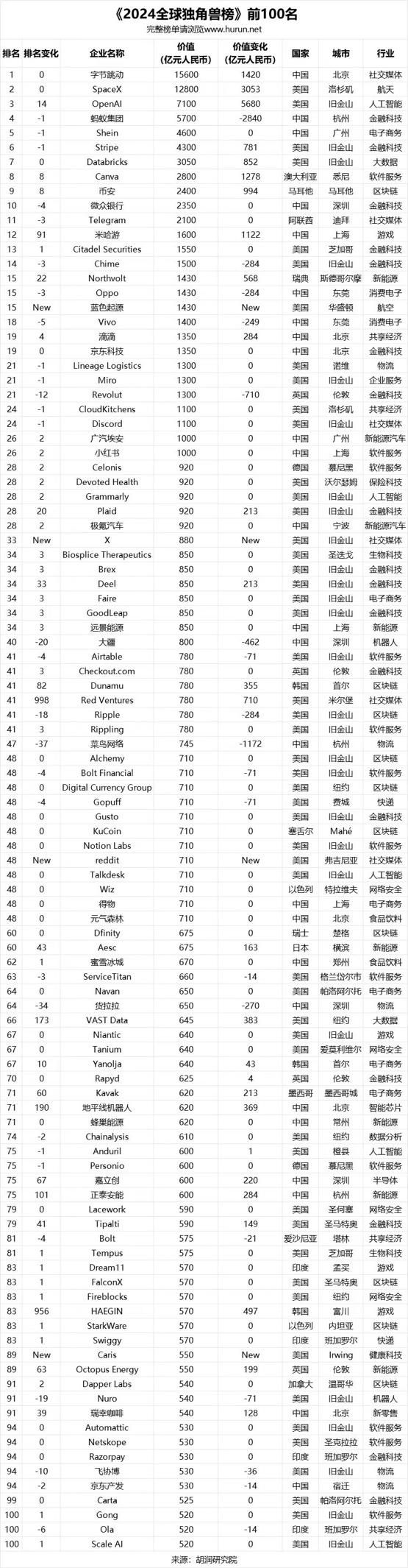 附:2024全球独角兽榜百强名单