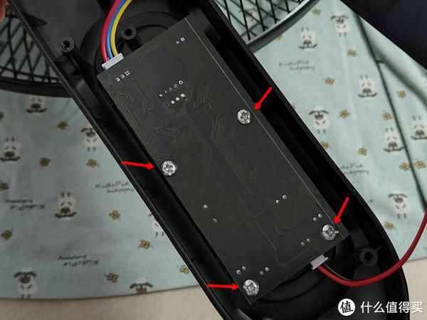 分离前盖和背壳后,可见黑色PCB控制板,拆除图示箭头处的四颗螺丝,并拔除上下两条连线后可拆出控制板。