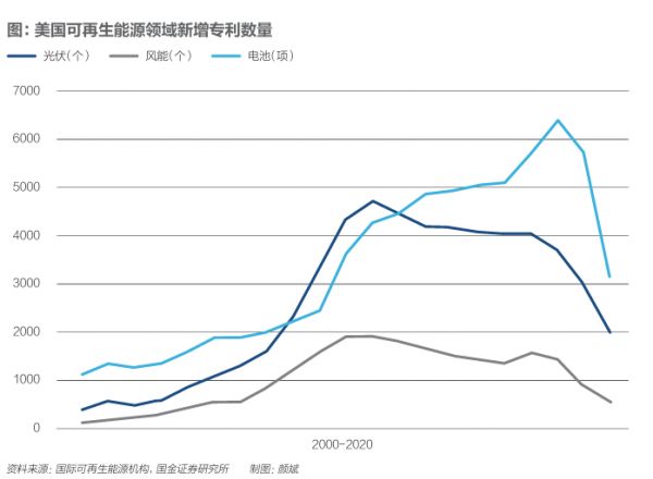 失去产业土壤的滋养,技术创新也逐渐枯萎。2012年前后,美国光伏领域年新增专利数量逐渐下滑。而中国虽然早期是海外光伏技术的追随者,但通过强大的产业化能力,实现了规模化量产、上下游产业链配套、工艺改进,目前已在多个领域实现技术领先。