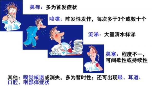 花粉过敏的症状与其他季节性过敏相似。症状包括鼻塞、流鼻涕、打喷嚏、眼睛发痒和流泪、头痛和疲劳等。过敏还会引发哮喘发作、接触性荨麻疹。花粉过敏和感冒的症状也有所不同。许多人过敏后,往往认为自己感冒了,直接当成感冒治疗或自行吃感冒药,滥用抗生素和药物。