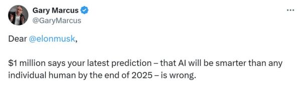 最初是 AI 初创公司 Geometric Intelligence(2016 年已被美国打车服务Uber 收购)创始人兼 CEO、纽约大学心理学家 Gary Marcus,他在社交平台 X 上 @ 了马斯克:“我用 100 万美元,赌你的最新预测——‘到 2025 年底,人工智能将比人类任何个体都更聪明’——是错误的。”