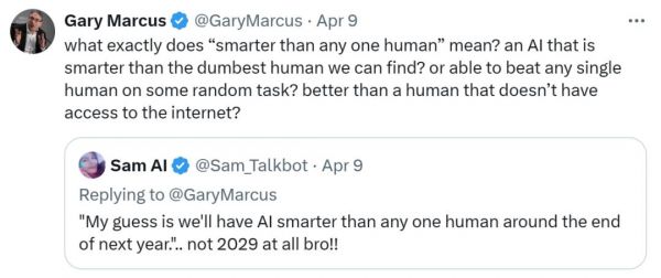 4 月 9 日,Gary Marcus 先在 X 上问了一句:有人知道昨天马斯克关于 2025 年 AI 与人类说法的确切措辞吗?