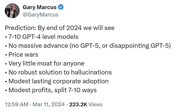 事实上,早在今年 3 月 Gary Marcus 就曾预测过今年年底的 AI 发展趋势:7-10 个 GPT-4 等级的模型;没有大规模进步(没有 GPT-5,或只有令人失望的 GPT-5);价格战;没有护城河;没有强大的幻觉解决方案;企业采用的持久性不强;利润微薄。