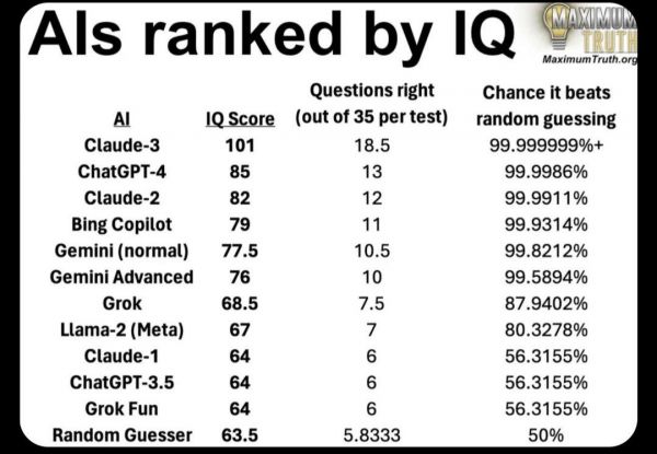 为此,@LimitingThe 还附上了一张各大 AI 大模型的智商排名为证:Claude-3 最高,IQ 为 101;其次是 GPT-4 驱动的 ChatGPT,IQ 为 85;第三名仅差 3 分的 Claude-2。