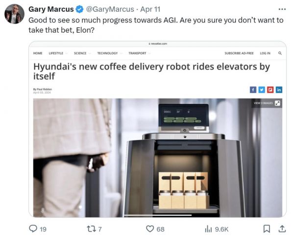 截至目前,马斯克并未对 Gary Marcus 提出的 1000 万美元赌约作出回应,甚至 Gary Marcus 还在昨天转发了一条《新型咖啡配送机器人可自行乘坐电梯》的新闻又讽刺了一把:“很高兴看到 AGI 取得如此大的进展。你确定不赌一把吗,埃隆?”