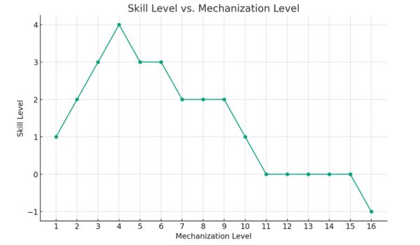 在机械化的初期阶段(等级1至4),技艺水平呈线性上升趋势,说明在这一阶段,随着机械化等级的逐步提升,工具仍然完全由工人控制,因此对工人的技艺要求随之增加。这表明在早期的机械化过程中,技术的引入实际上增加了工人所需的技能水平。