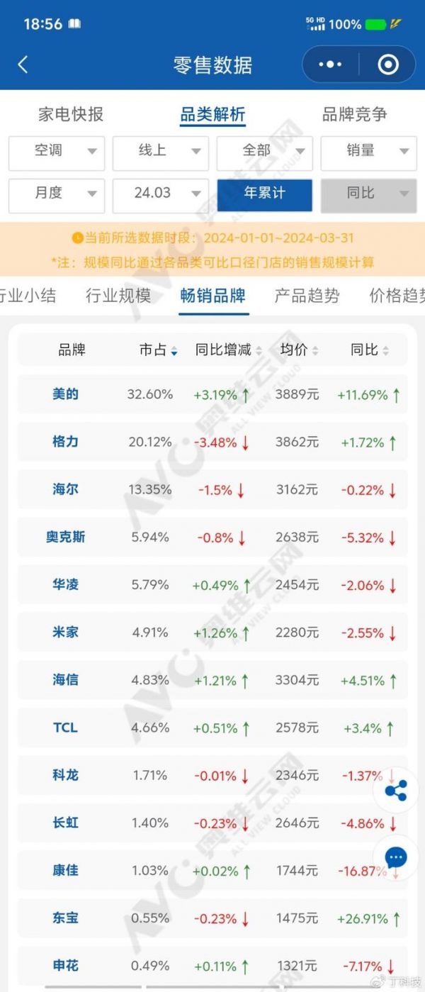 小米官宣空调市场份额行业第四,很可能是有其他的统计口径。参考奥维云网数据来看,销量份额排在4-8位的品牌差距不大,阶段性来看这几个品牌都有机会冲高到行业第四的位置。