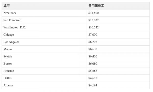 场地成本的节省是最显见的,下面是 SquareFoot 给出的调查数据,在美国主要城市,企业雇佣一位员工一年内所支付的平均场地成本。