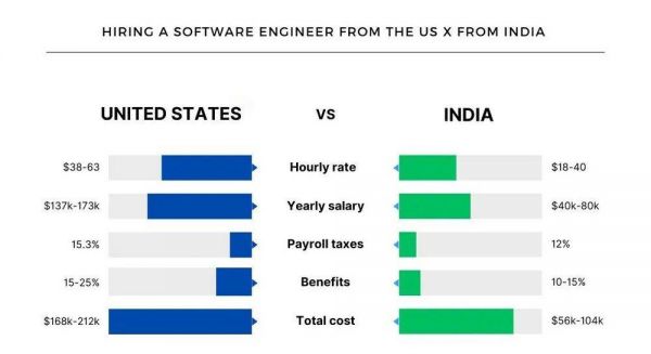 区域间发展是不平衡的,不同区域的生存成本差异巨大。在生活成本较低的区域的工作者,对于薪资要求不会像生活在较高生活成本地区的工作者那么高,这就形成了人力资源价值中的“价格洼地”,企业得以雇佣这些生活在低生活成本区域的员工,从而减少成本。相较于直接雇佣一位美国本地的软件工程师,美国的科技公司雇佣来自印度的软件开发工程师能节省将近70% 的人力成本。