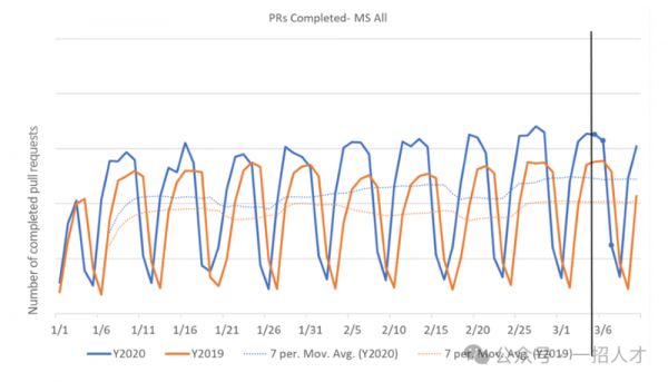微软也在远程办公期间,对员工的工作效率进行了调研,如下图所示,工程师提交代码的次数相较于驻地办公期间,反而在稳步地上升。