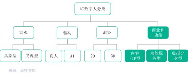 从不同维度分为多种类型,从宏观层面,分为具象数字人和灵魂数字人,分别体现在数字化的内容和基于人类思维的形态;从驱动方式维度,分为真人驱动和AI驱动,分别由使用者加AIGC输入驱动和AI独立决策;从渲染路径划分,有2D数字人和3D数字人的区分;以及按功能和商业性分为内容/IP型、功能服务型和虚拟分身等多种类别。本报告主要按照从商业和功能维度下的数字人分类进行内容撰写。