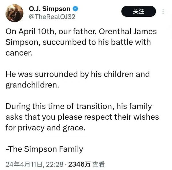 北京时间4月11日晚上10点28分,58天未更新社交账号的O.J. Simpson(下称“辛普森”)的X账号发布了一则声明,“4月10日,我们的父亲Orenthal James Simpon在与癌症的斗争中去世,儿孙们都陪在他的身边,在这个过渡时期,他的家人请求你们尊重他们对隐私的愿望。”