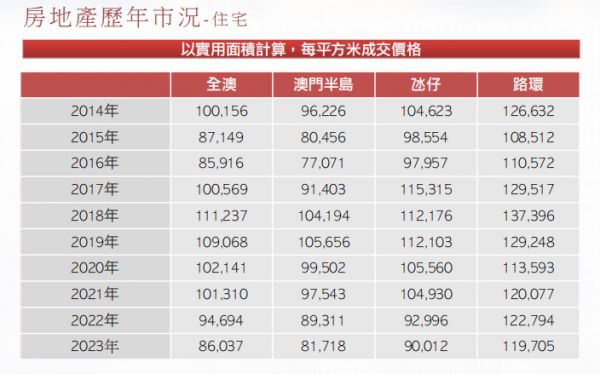 2019年四季度,澳门住宅平均成交价为104468澳门元/平方米,2023年四季度则为89259澳门元/平方米。(注:1澳门元≈0.8962元人民币)