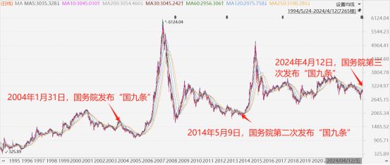 前两次的“国九条”,先后发布在2004年、2014年,为2007年沪指创出6124点、2015年创出5178点的大牛市行情埋下关键伏笔。