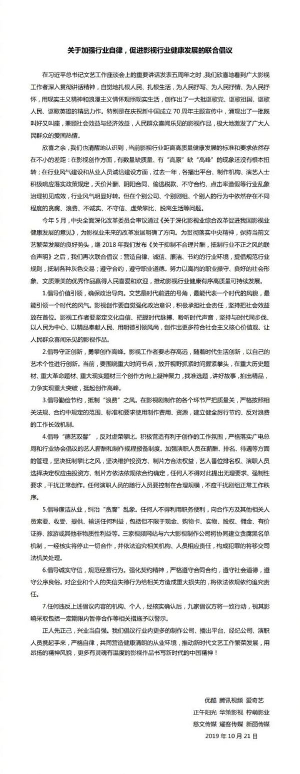 10月21日,优酷、腾讯视频、爱奇艺三家视频网站,联合正午阳光、华策影视、柠萌影业、慈文传媒、耀客传媒、新丽传媒六家影视制作公司,共同发布《加强行业自律,促进影视行业健康发展》的联合倡议:营造自律、诚信、廉洁、节约的行业环境,提倡规范行业规则,抵制各种灰色交易;遵守合约,遵守职业道德。努力以高尚的职业操守、良好的社会形象、文质兼美的优秀作品赢得人民喜爱和欢迎,推动影视行业健康有序高质量可持续发展。