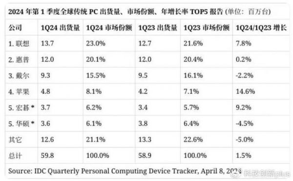 近日IDC发布了2024年Q1全球PC销量数据,可以看到联想、夏普、戴尔位列前三名,份额分别是23%、20.1%、15.5%。