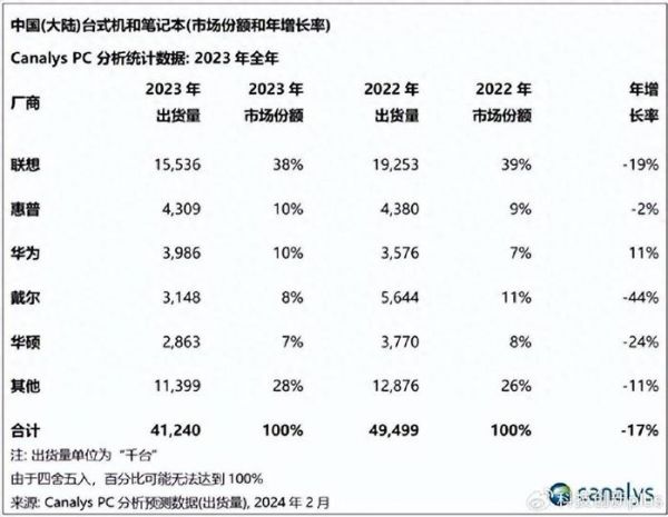 PC销量:联想全球和中国都第1,华为中国第3,全球其它