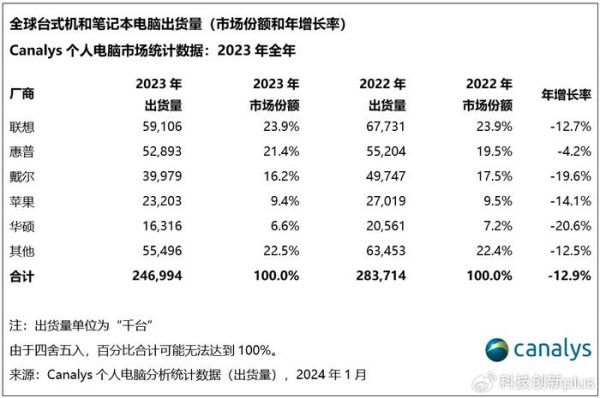2023Q4 全球 PC 战报:联想增长 4% 领衔、惠普增长 5% 排第二