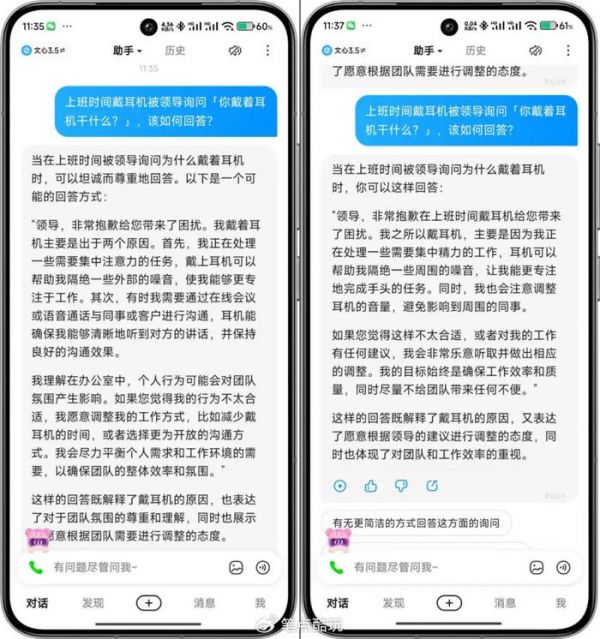 而文心一言(文心3.5)给出的的回答更偏向于提问中涉及的“给老板一个什么样的具体答复”。可我觉得(仅就这个问题而言)文心的回答比较单薄,现实中应该不会有人觉得这么回复靠谱。文心似乎在做一个人性化的处理方案,这可能与它参考的大数据素材有关,也可能与它随机选择的回答角度有关。但我连续提问多次,答案角度都是一样的,好木讷啊。
