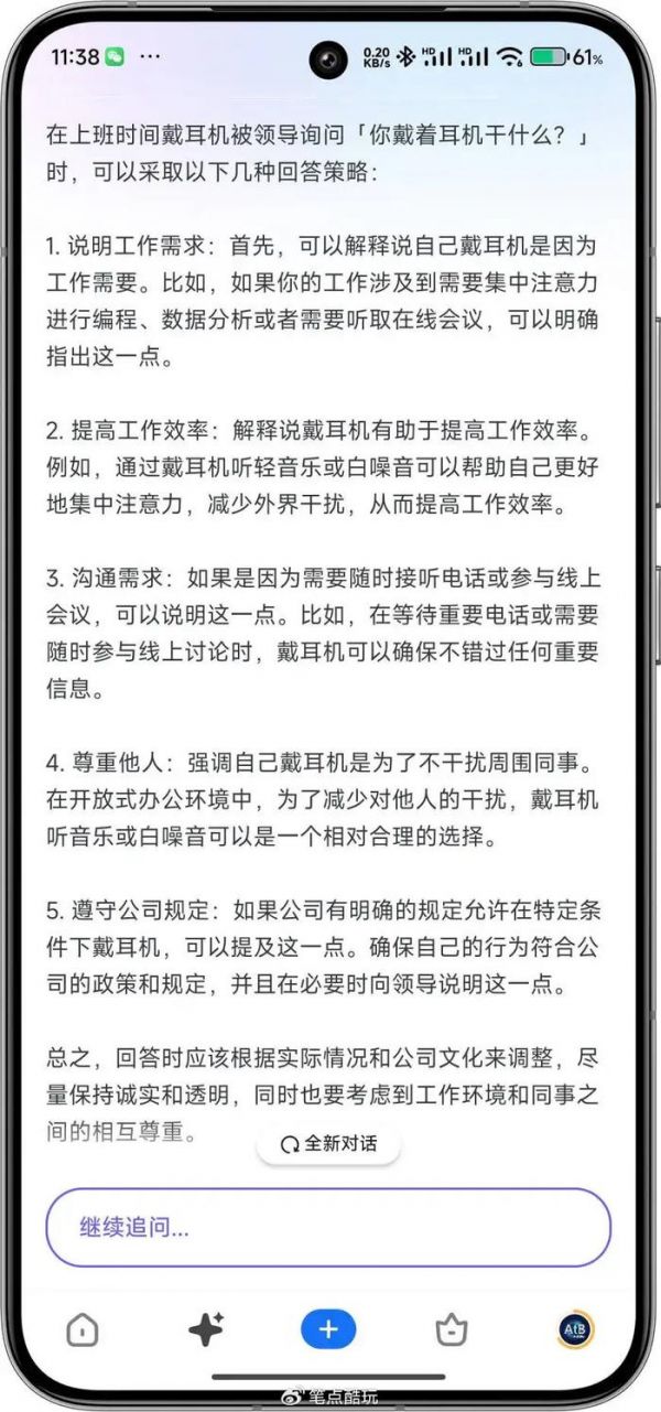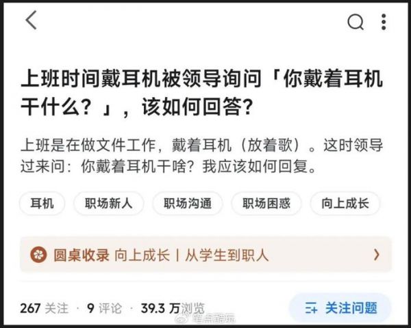 比如之前刷到的一个“职场题”:《上班时间戴耳机,被领导询问:你戴耳机干什么?你应该如何回答?》