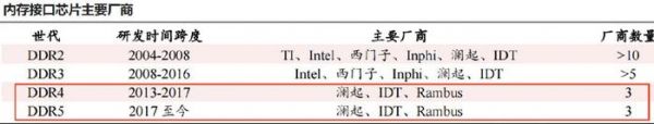 目前,存储芯片已经从DDR2迭代到DDR5,而全球能生产DDR4及以上内存接口芯片的厂商只有澜起科技、Rambus和瑞萨(IDT)3家。