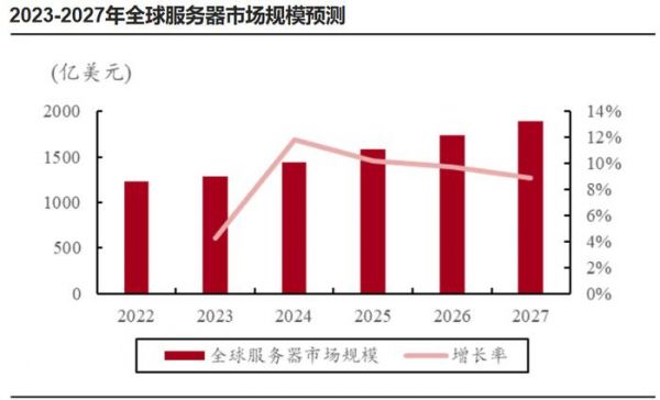 根据预测,2023年全球服务器市场规模1284.71亿美元,到2027年规模将增长到1891.39亿美元。2024年刚去库存结束,全球服务器整机出货量将增长约2.05%,1365.4万台左右,之后增长速度有望加快。