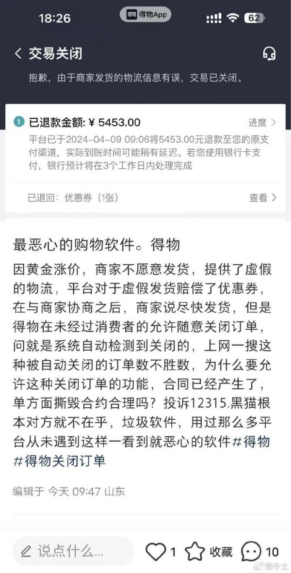 其中,在得物平台,网友反映商家在黄金涨价后提供虚假的物流单号,后平台未经消费者允许直接关闭其订单,消费者表示在12315和黑猫平台投诉后也仍未得到解决。