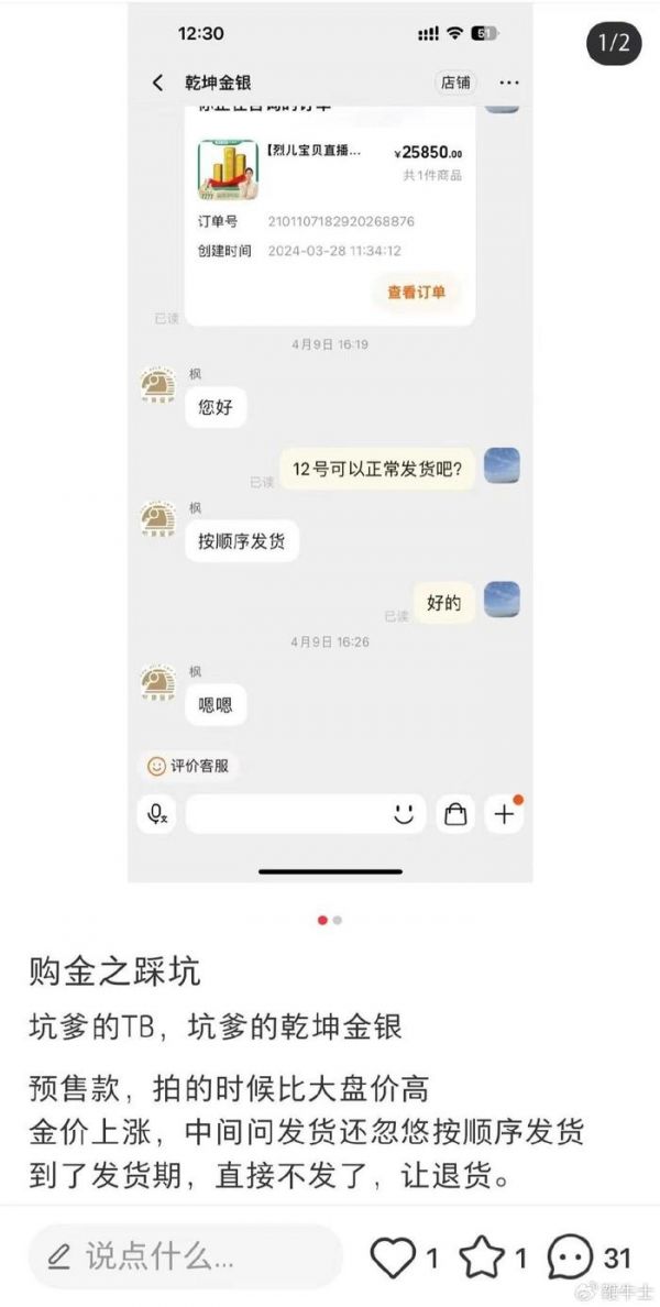 发起投诉的消费者称4月2号买的黄金4月12日还没有发货,根据消费者的留言,截至目前,事情还未得到处理。