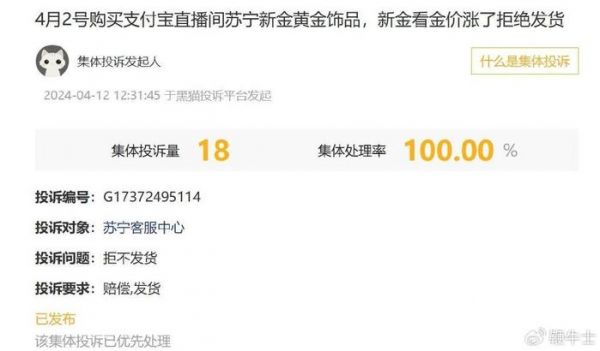 不仅如此,在黑猫投诉平台近日发起的支付宝直播间集体投诉,目前集体投诉量已达18起,投诉对象是苏宁新金黄金饰品直播间。