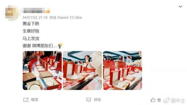4月13日,金价出现下滑,也有水贝经销商在微博直言黄金下跌了!可以发货了!
